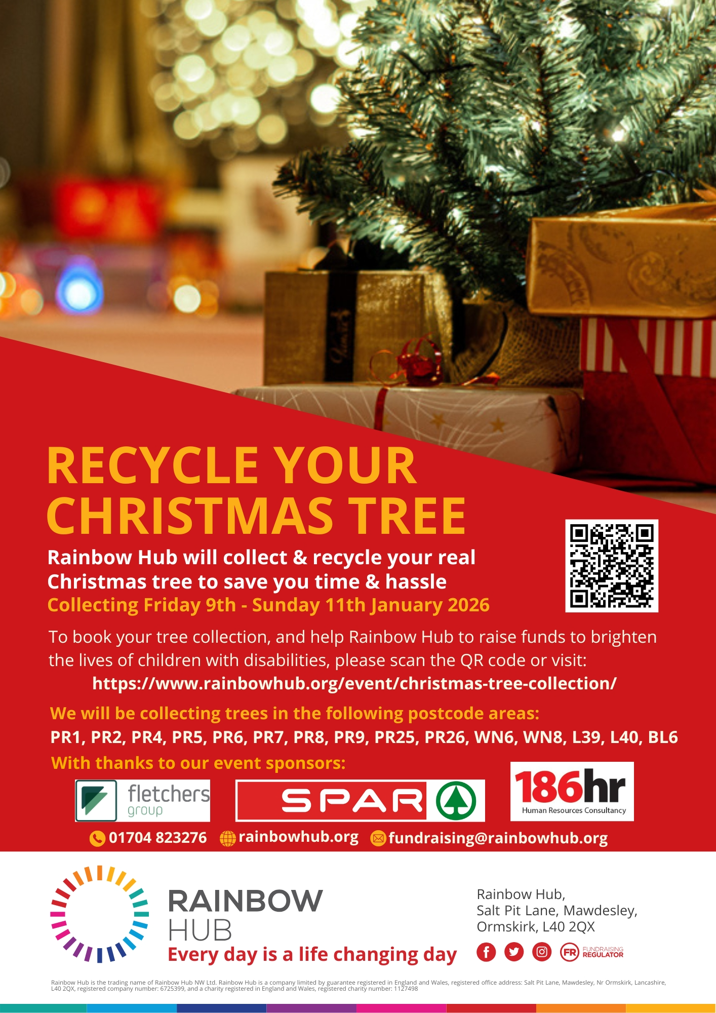 Every year Rainbow Hub runs a Christmas Tree collection to help raise funds to continue our services for children and young people with disabilities. In January 2025 we collected and recycled 900 Christmas trees and raised over £20,000 and we are aiming to top this in 2026.